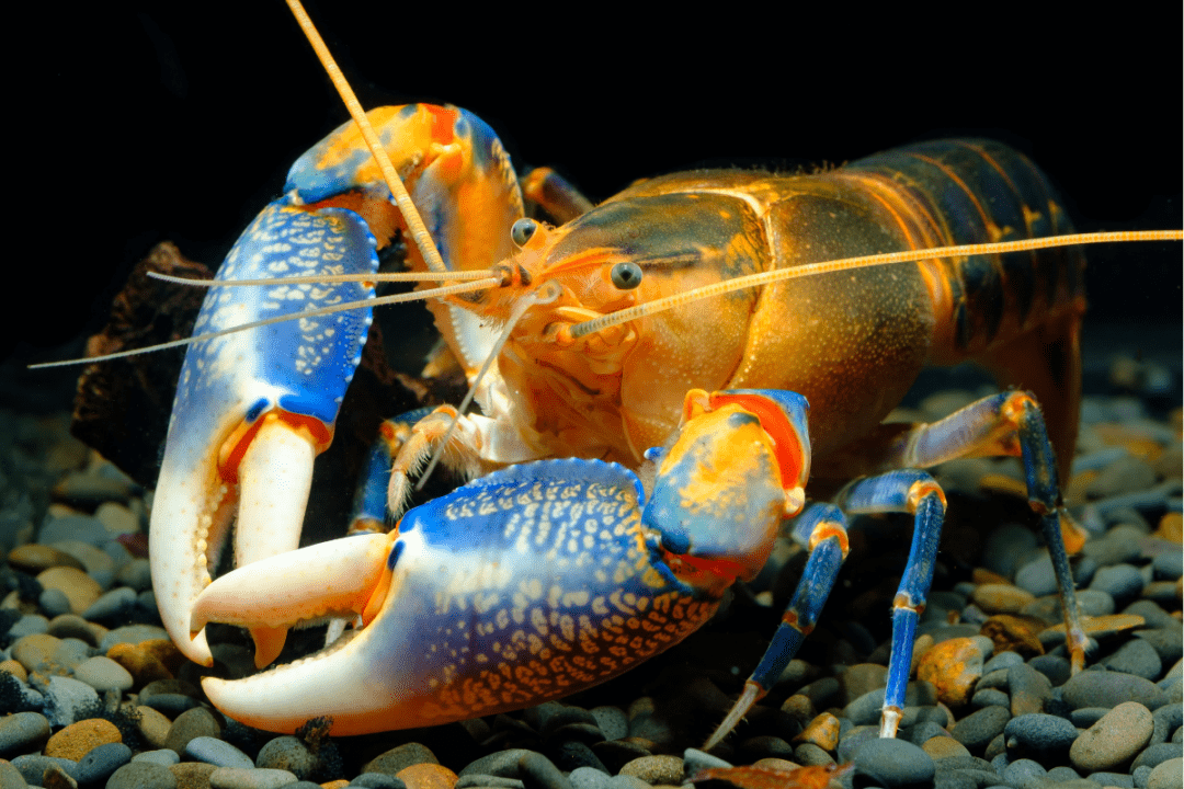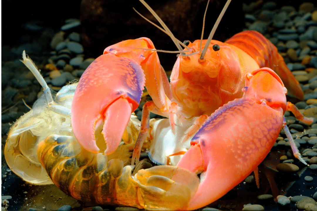Der neue Panzer ist anfangs sehr weich, daher nennt man die Krebse in dieser Phase Butterkrebse. Auch die Färbung ist noch viel heller und dunkelt dann erst mit der Aushärtung nach. Das folgende Bild zeigt einen frisch gehäuteten Cherax vulcano, auf dem Bild danach sieht man schon wieder die charakteristische Färbung.