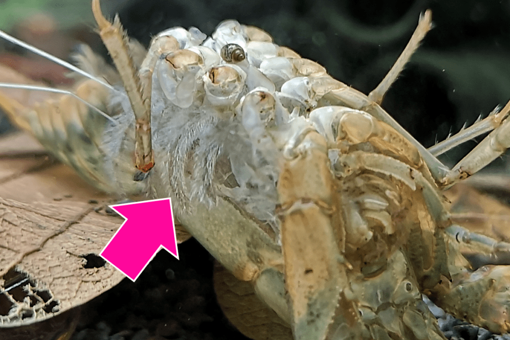 Wie bereits erwähnt häutet sich der Krebs komplett inkl. Kiemen und kann daher während der Häutung nicht atmen. Daher ist es wichtig, dass die Häutung nicht zu lange dauert. Im Bild habe ich euch die puscheligen Kiemen gekennzechnet.